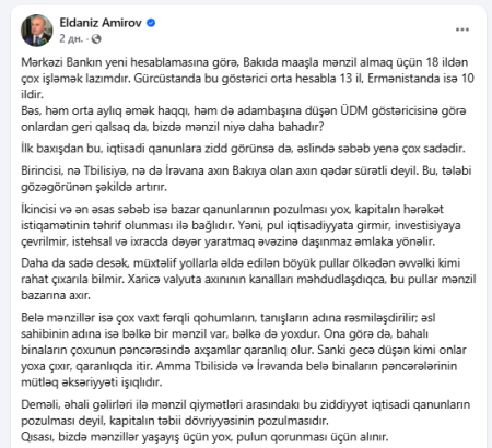 Bizim.Media xəbər verir ki, bunu iqtisadçı Eldəniz Əmirov sosial şəbəkə hesabında yazıb.