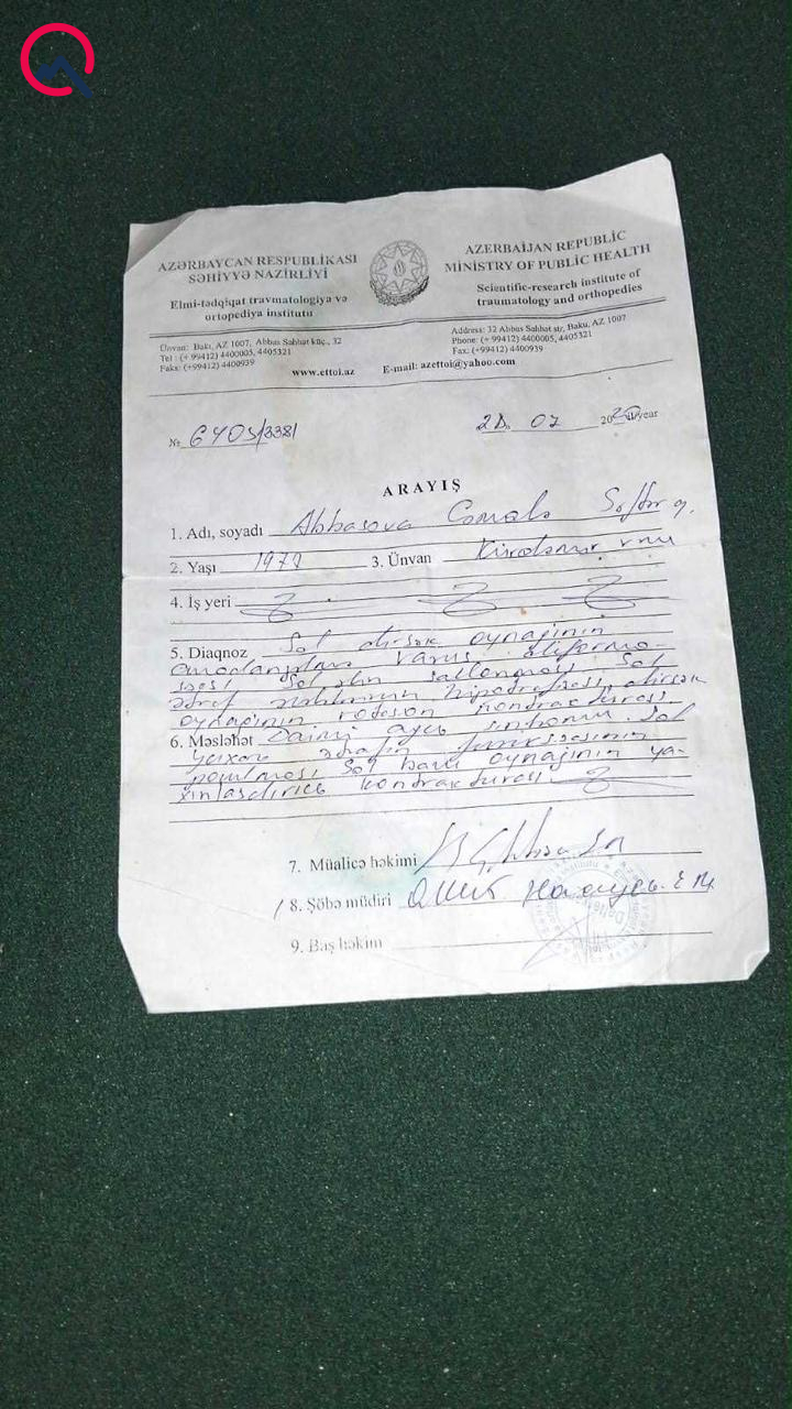 TƏBİB-dən isə sorğumuza cavab olaraq bildirilib ki, C. Abbasovanın əlilliklə bağlı müraciəti araşdırılıb: Araşdırmaya əsasən, vətəndaşın sağlamlıq vəziyyətinin qiymətləndirilməsi məqsədilə 28.12.2020-ci il tarixdə tibbi-sosial ekspertiza müayinəsinə göndərişi rəsmiləşdirilmiş Tibbi Sosial Ekspertiza Komissiyası (TSEK) tərəfindən imtina edilib. Səbəb kimi “Əlavə müalicəyə ehtiyacın olması - Əlilliyin təyini üçün müalicə müddəti yeterli deyil”. qeyd edilib.