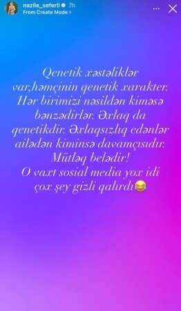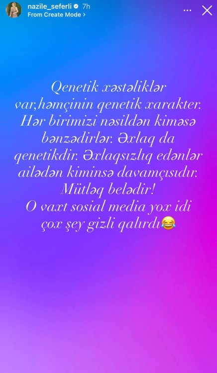 "Əxlaq da genetikdir. Əxlaqsızlıq edənlər ailədən kiminsə davamçısıdır. Mütləq belədir. O vaxt sosial media yox idi, çox şey gizli qalırdı" deyə, Nazilə sözlərinə davam edib.