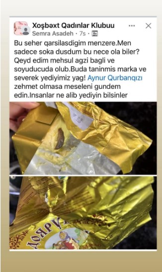 Tribuna-nın məlumatına görə, bu barədə sosial şəbəkədə Səmra adlı xanım yazıb. Foto da paylaşan şikayətçi bildirib ki, yağ ağzı bağlı formada soyuducuda olub: