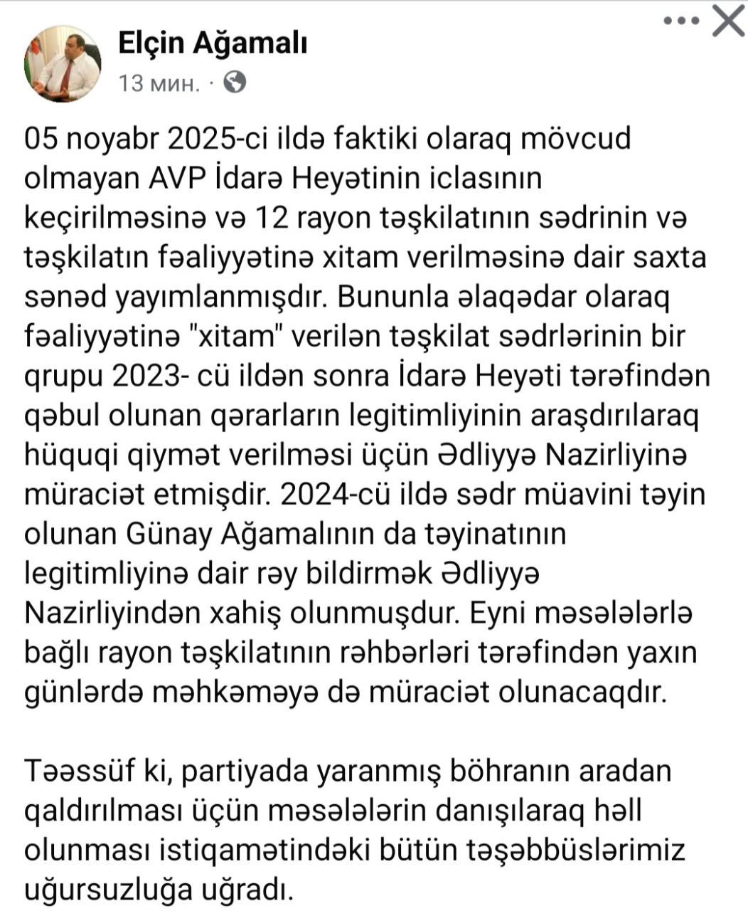 “2024-cü ildə sədr müavini təyin olunan Günay Ağamalının da təyinatının legitimliyinə dair rəy bildirmək Ədliyyə Nazirliyindən xahiş olunub. Eyni məsələlərlə bağlı rayon təşkilatının rəhbərləri tərəfindən yaxın günlərdə məhkəməyə də müraciət olunacaq.