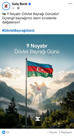 “Xalq Bank” ASC 9 Noyabr – Bayraq Günü münasibətilə sosial şəbəkə səhifələrində etdiyi paylaşımda kobud səhvə yol verib.