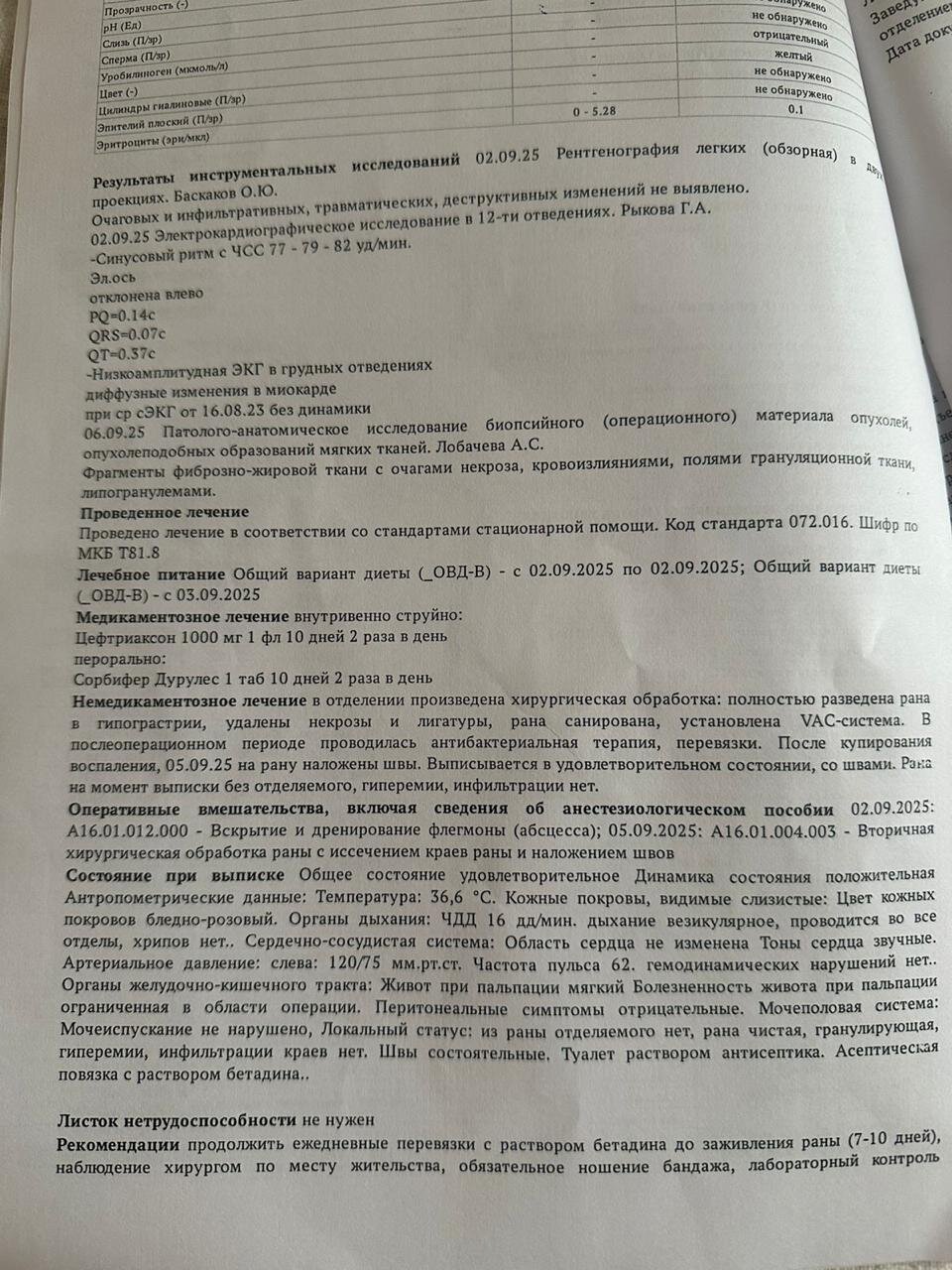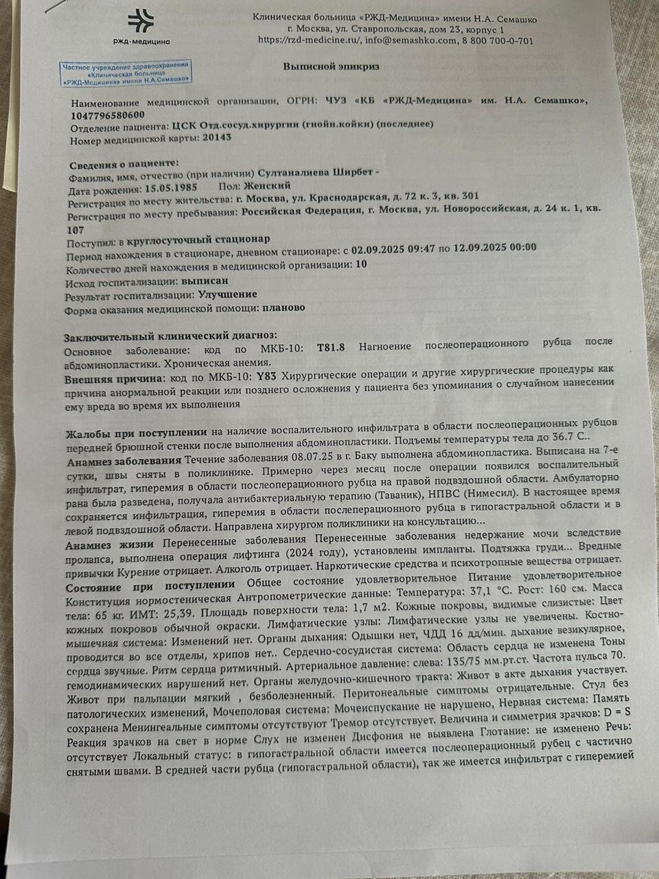 Şikayətçi hələ də sağlamlağını bərpa edə bilmədiyini bildirir. Uğursuz əməliyyatın tikiş yerləri hələ də sağalmayıb. İstənilən əməliyyatdan sonra müəyyən bərpa prosesi olur. O müddət çoxdan keçsə də heç bir irəliləyiş hiss olunmur. Əməliyyatdakı kəsiklər birləşmir.